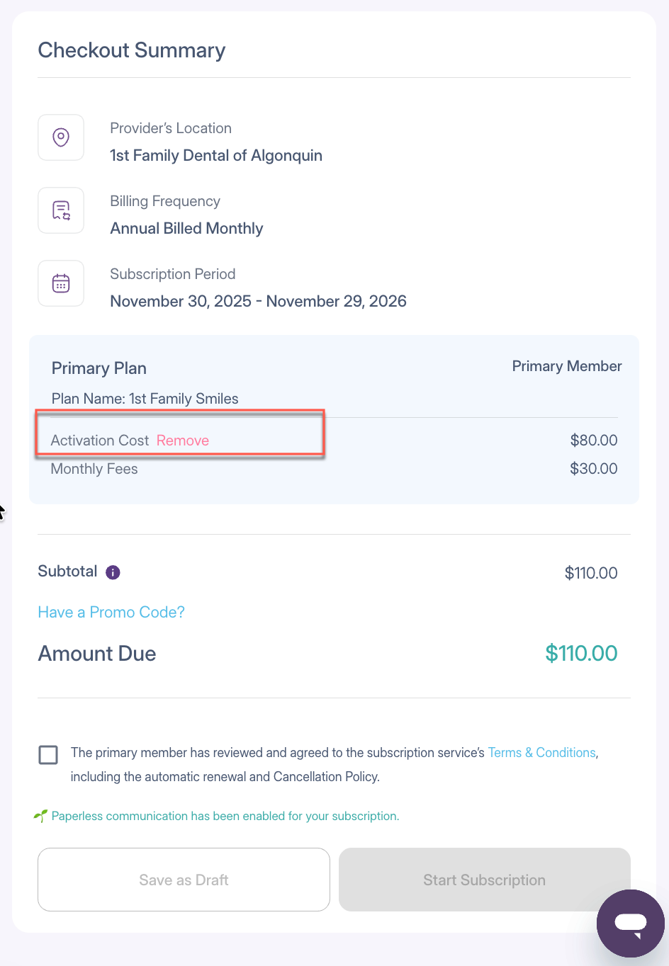 However, the office has the option to waive the activation fee during checkout when creating or re enrolling the subscriber through the provider portal. This may be done in accordance with your group or location policies.