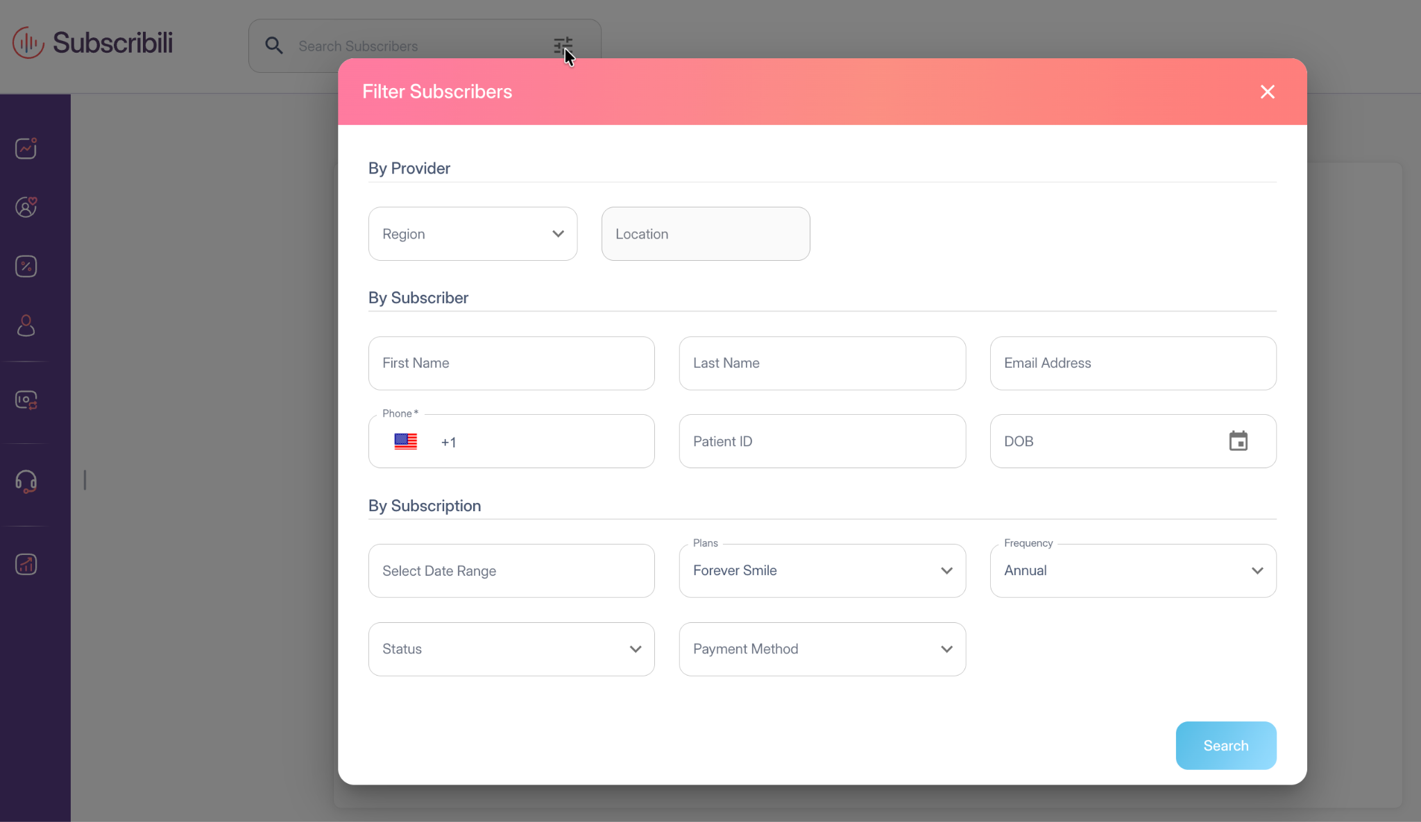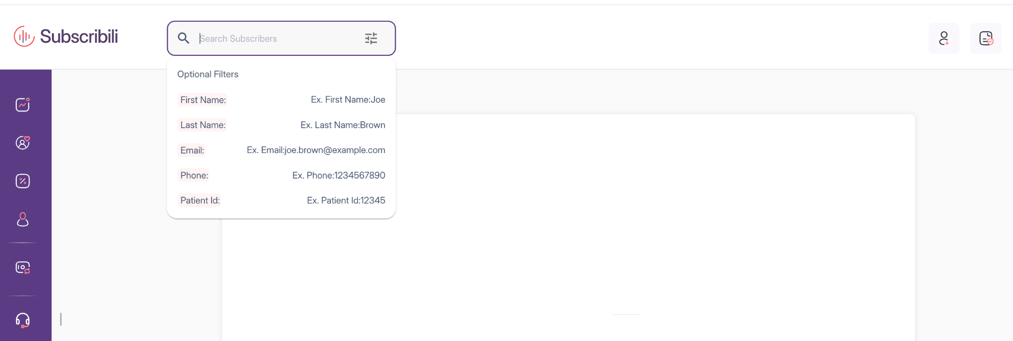 These additional filters help staff identify the correct subscriber quickly, even in large practices or multi location environments where lists may contain thousands of members. Together, Global Search and Quick Search provide a fast, accurate, and user friendly experience that reduces unnecessary clicks and supports real time subscriber lookup across the entire organization.